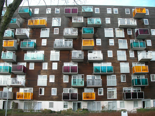 En principio, el pedido de la Asociación de Vivienda Het Oosen fue de 100 viviendas para personas mayores de 55 años, pero debido a las regulaciones de la zona, sólo se podrían construir 87 unidades. De igual forma, los arquitectos encontraron la solución y las 13 unidades que faltaban las “colgaron” de la estructura mayor, en su fachada norte. Además también cuelgan varios balcones con cristales de colores que hacen que el edificio sea más genial aún.