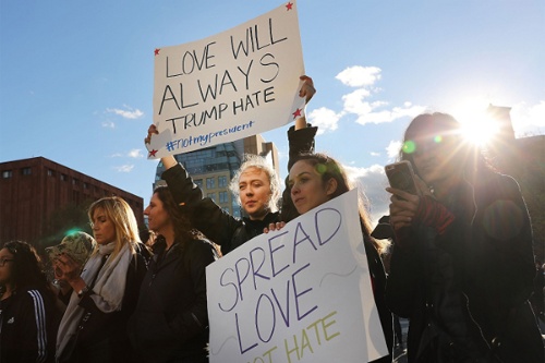 En Nueva York, los manifestantes volvieron a reunirse en el Washington Square Park y en la Trump Tower, donde vive el presidente electo, en la Quinta Avenida. Trump, quien inicialmente criticó a los manifestantes que protestan contra su elección y dijo que habían sido «incitados» por los medios de comunicación, cambió de tono y los elogió el viernes.